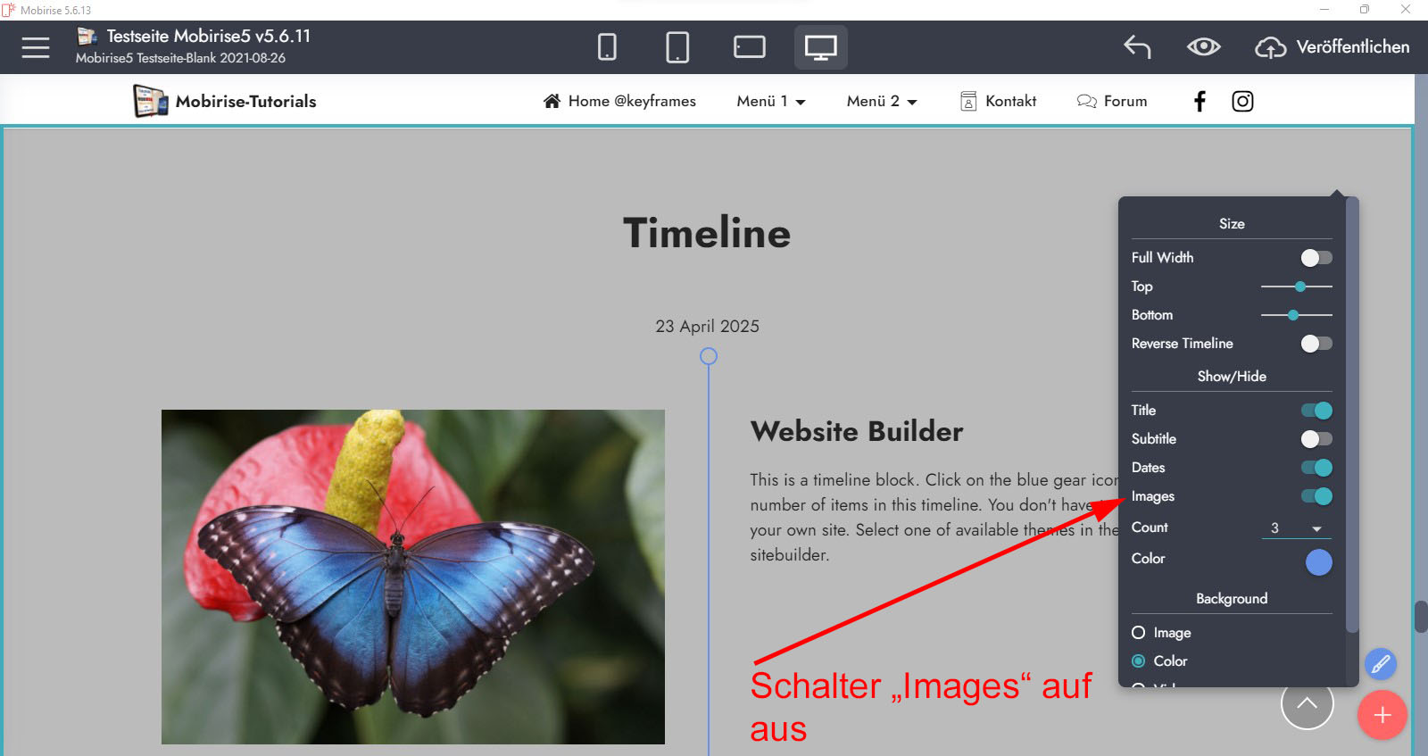 Auf dieser Testseite habe ich eine Timeline aus dem Standard-Thema "Mobirise4":