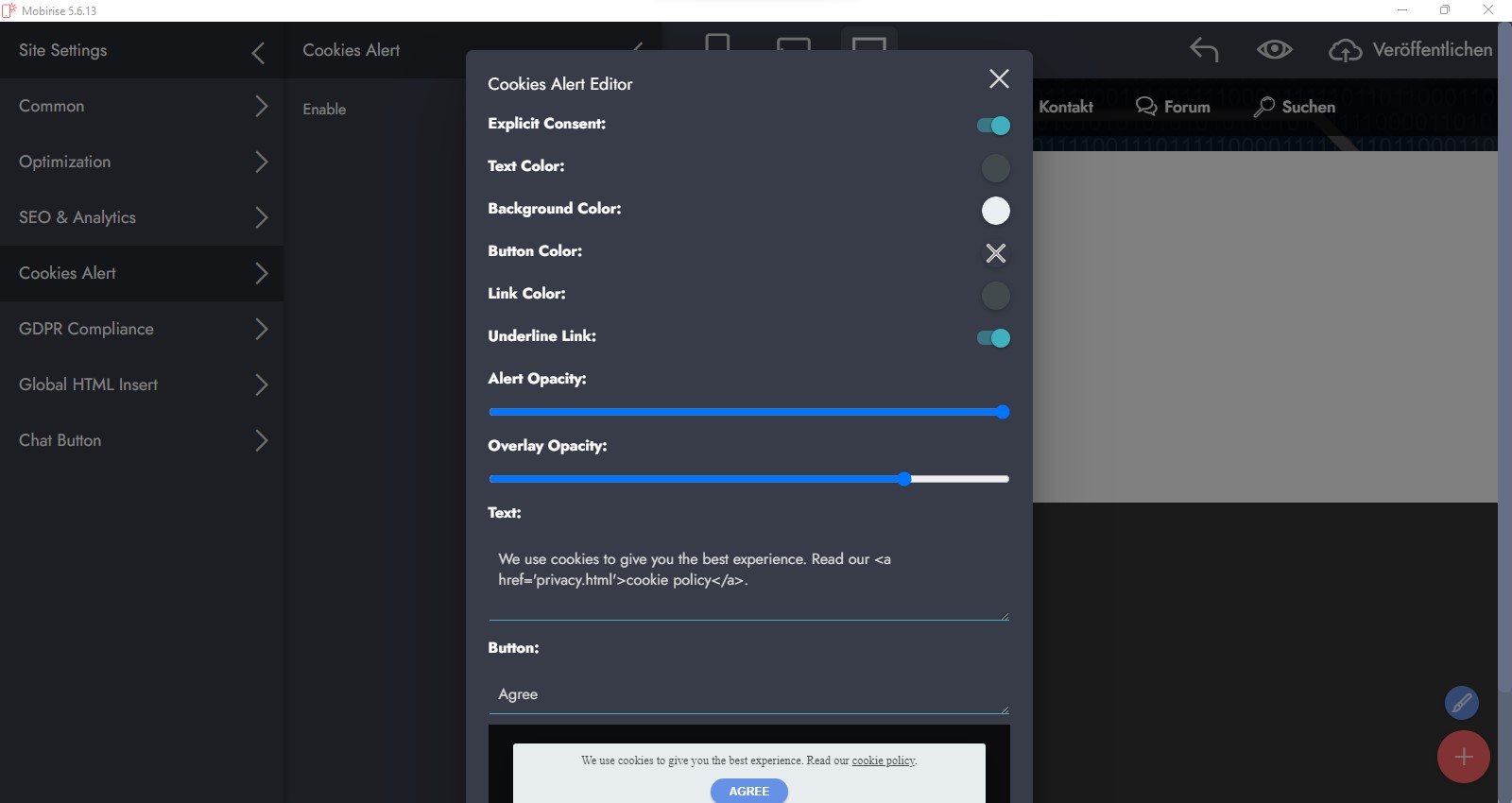 Mobirise selbst hat aber auch die Möglichkeit die Seite komplett zu sperren bevor den Cookies nicht zugestimmt wurde - allerdings keine Auswahl, was ich persönlich auch nicht als zwingend notwendig erachte (keine Rechtsberatung).