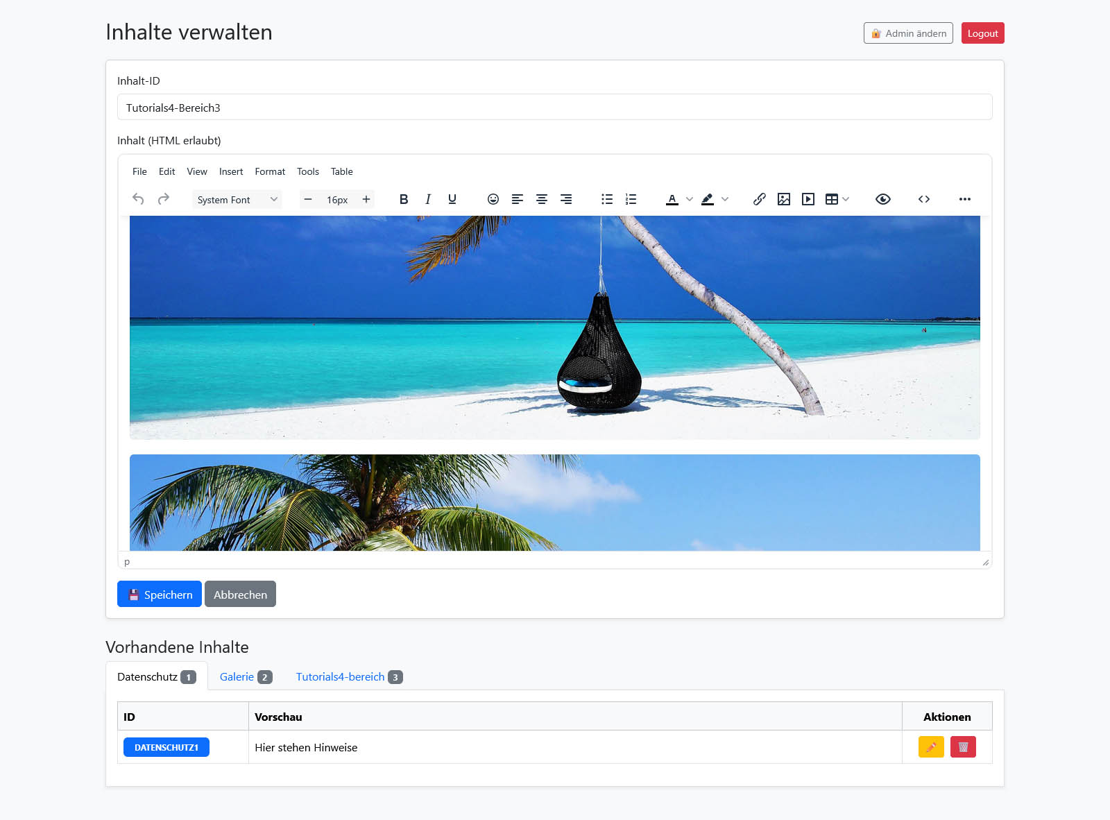 Wichtig: Tragt oben links im Feld „Inhalt‑ID“ die ID ein, unter der dieser Inhalt in einem beliebigen Mobirise‑Block angezeigt werden soll. Gebt der ID am Ende eine fortlaufende Ziffer (für den ersten Block …1, für einen weiteren Block derselben Seite …2 usw.). Nach einem Klick auf „Speichern“ werden die so sortierten Inhalte in der Übersicht unten angezeigt und lassen sich später über den Bleistift‑Button ✏️ wieder in den Editor laden und weiterbearbeiten. Für eine andere Seite vergebt ihr einen neuen Namen nach demselben Prinzip – wieder mit einer fortlaufenden Ziffer am Ende. Dadurch wird ein neuer Tab in der Übersicht unten erstellt.