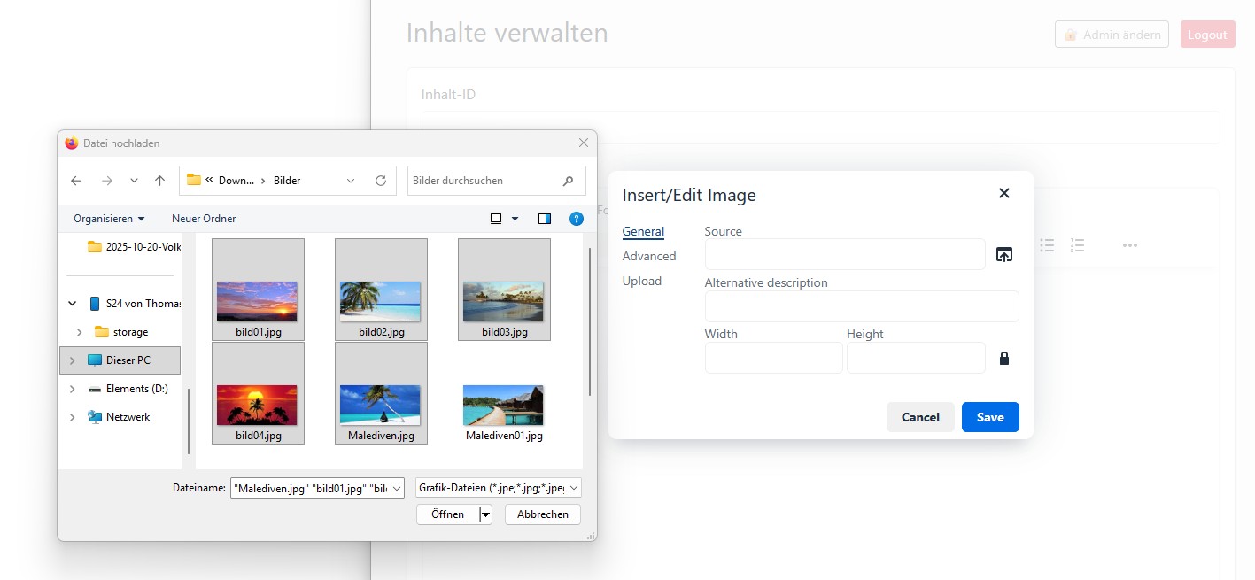 Das Login-Fenster des TinyMCE CMS-Editors öffnet sich. Gebt sowohl als Benutzername als auch als Passwort jeweils "admin" ein. Danach öffnet sich das Dashboard. Tragt sofort eure gewünschten Zugangsdaten ein: Klickt dazu oben rechts auf "Admin ändern" und gebt den neuen Benutzernamen sowie das Passwort ein. Anschließend werdet ihr ausgeloggt und müsst euch neu anmelden.