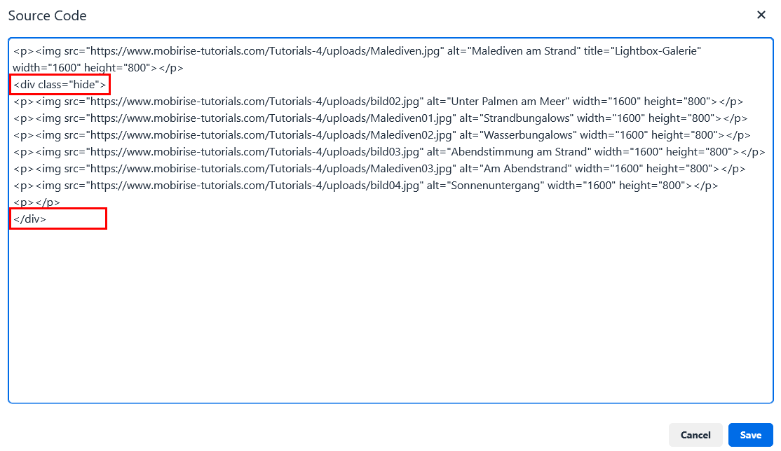 Ich habe die Bilder ganz normal über den TinyMCE-Editor vom CMS hochgeladen und dann über die Schaltfläche (< >) für den Quellcode (Source Code) ein <div class="hide"> um die zusätzlichen, versteckten Bilder gesetzt.
